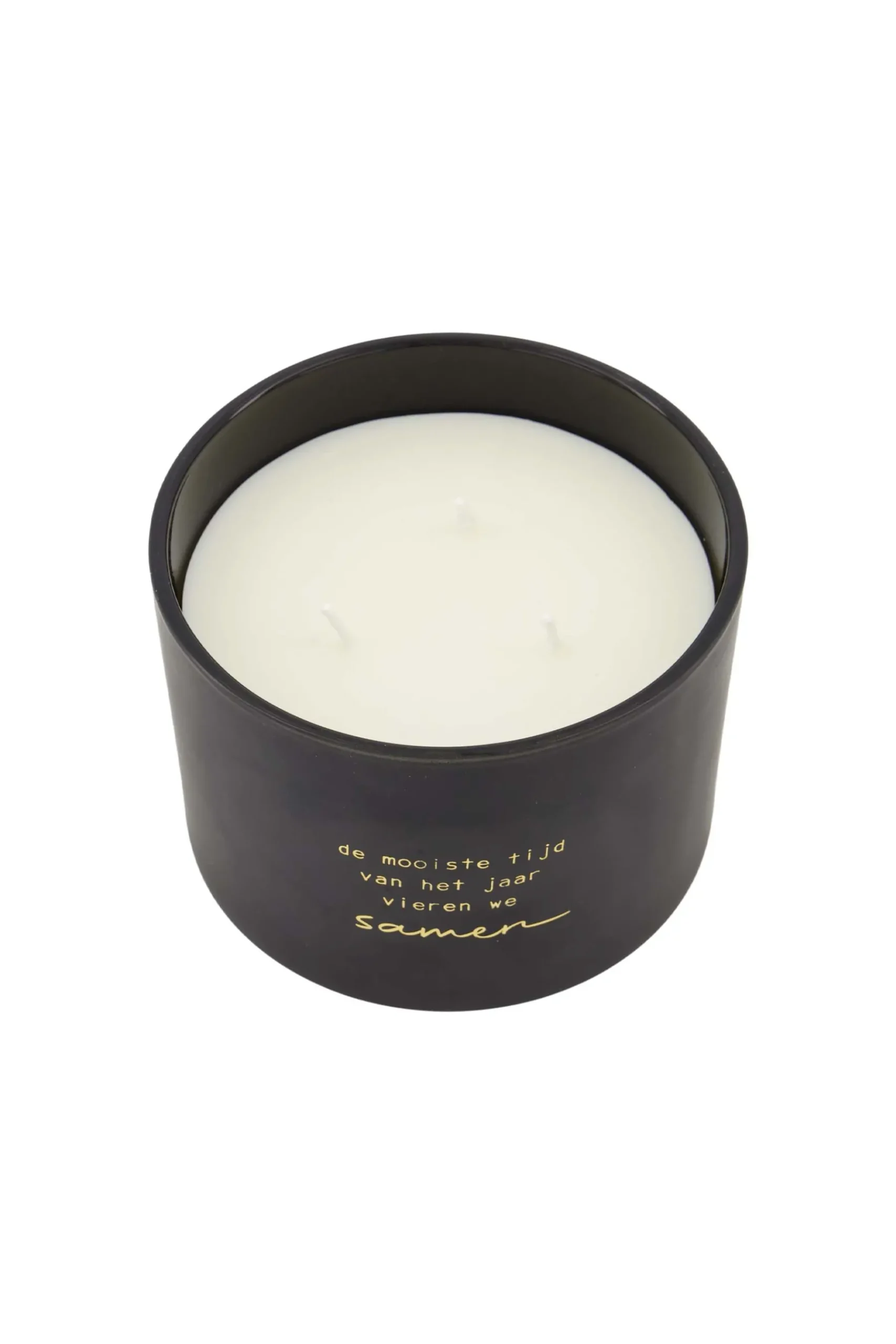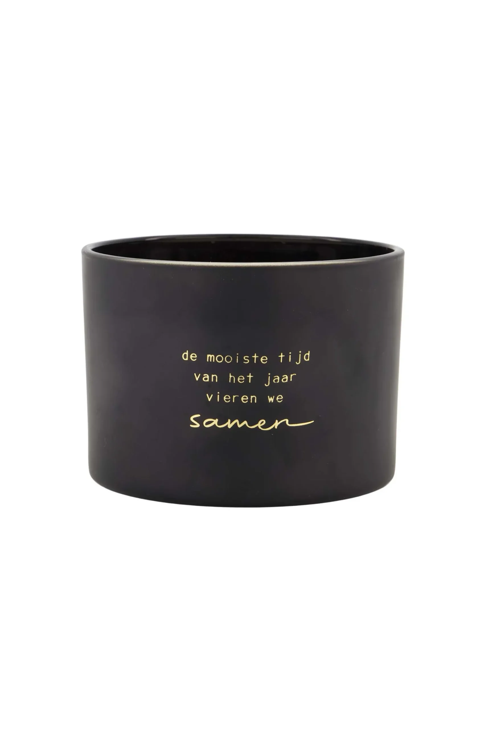 Zusss geurkaars mooiste tijd van het jaar winterbloem zwart|Deze geurkaars van Zusss ziet er zo gezellig uit! En hij ruikt ook nog eens heerlijk naar een zoete, houtachtige geur. Op deze heerlijke geurkaars staat de tekst: de mooiste tijd van het jaar vieren we samen. Perfect voor tijdens de feestdagen! De geurkaars zit in een zwart glas met daarin drie lontjes. Dit item heeft een doorsnede van 12cm, is 9,5cm hoog en heeft ca 60 branduren. Ook erg leuk te combineren met een Zusss kaarsenhouder! |Zusss: basic, stoer, uniek en een tikkeltje eigenwijs.