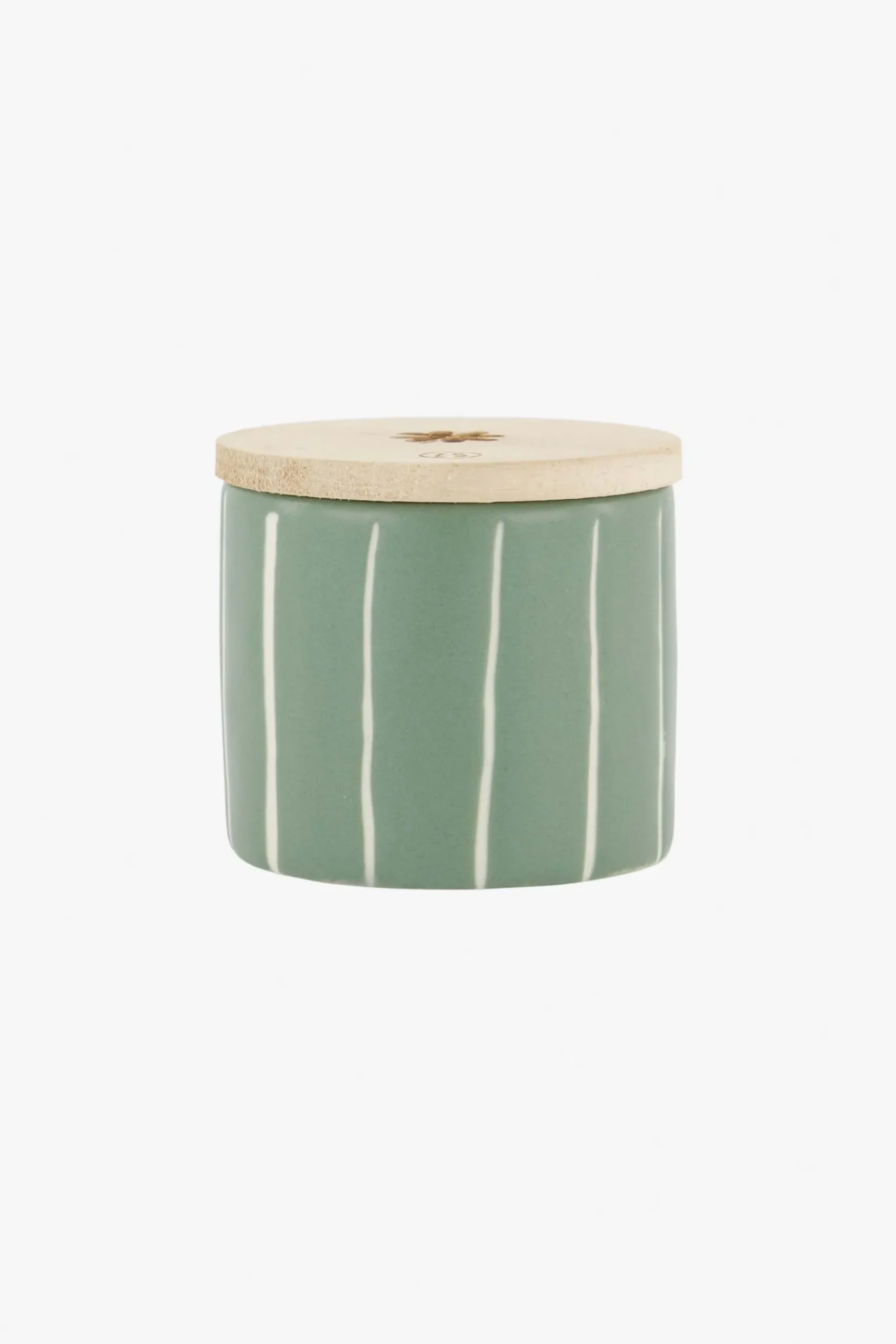 Zusss keramieken geurkaarsje met houten deksel klavertje salie|Keramieken geurkaarsje van Zusss met houten deksel. Deze leuke geurkaars laat je woonkamer heerlijk ruiken! Het saliegroene keramiek heeft subtiele witte streepjes rondom. In het deksels zijn een klavertje en het logo van Zusss gebrand. Met dit houten deksel kun je de geurkaars afsluiten, ideaal! De doorsnede van deze geurkaars is 5,5 cm en de hoogte 5,5 cm. Tip: geef dit potje geluk kado! |Zusss: basic, stoer, uniek en een tikkeltje eigenwijs.