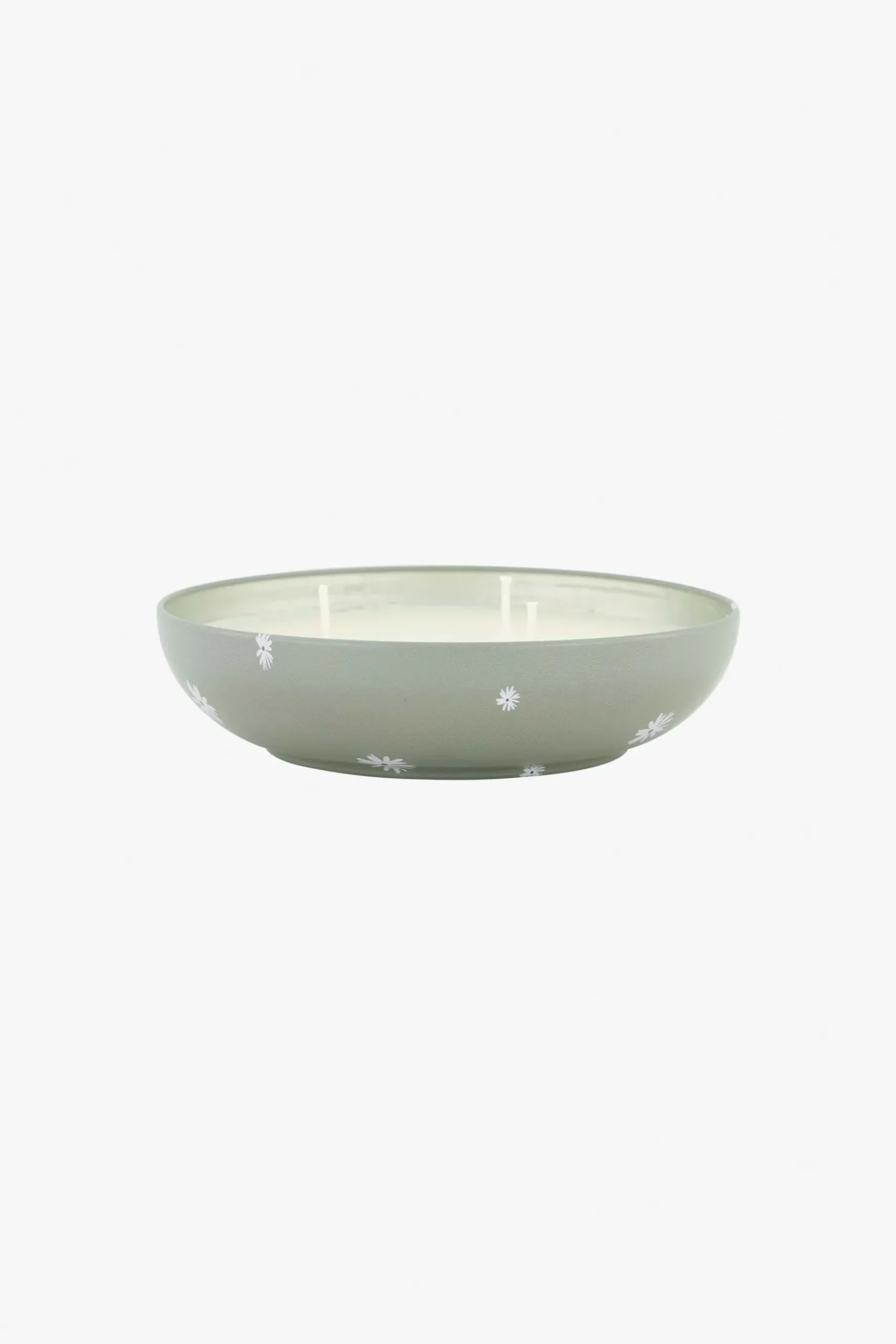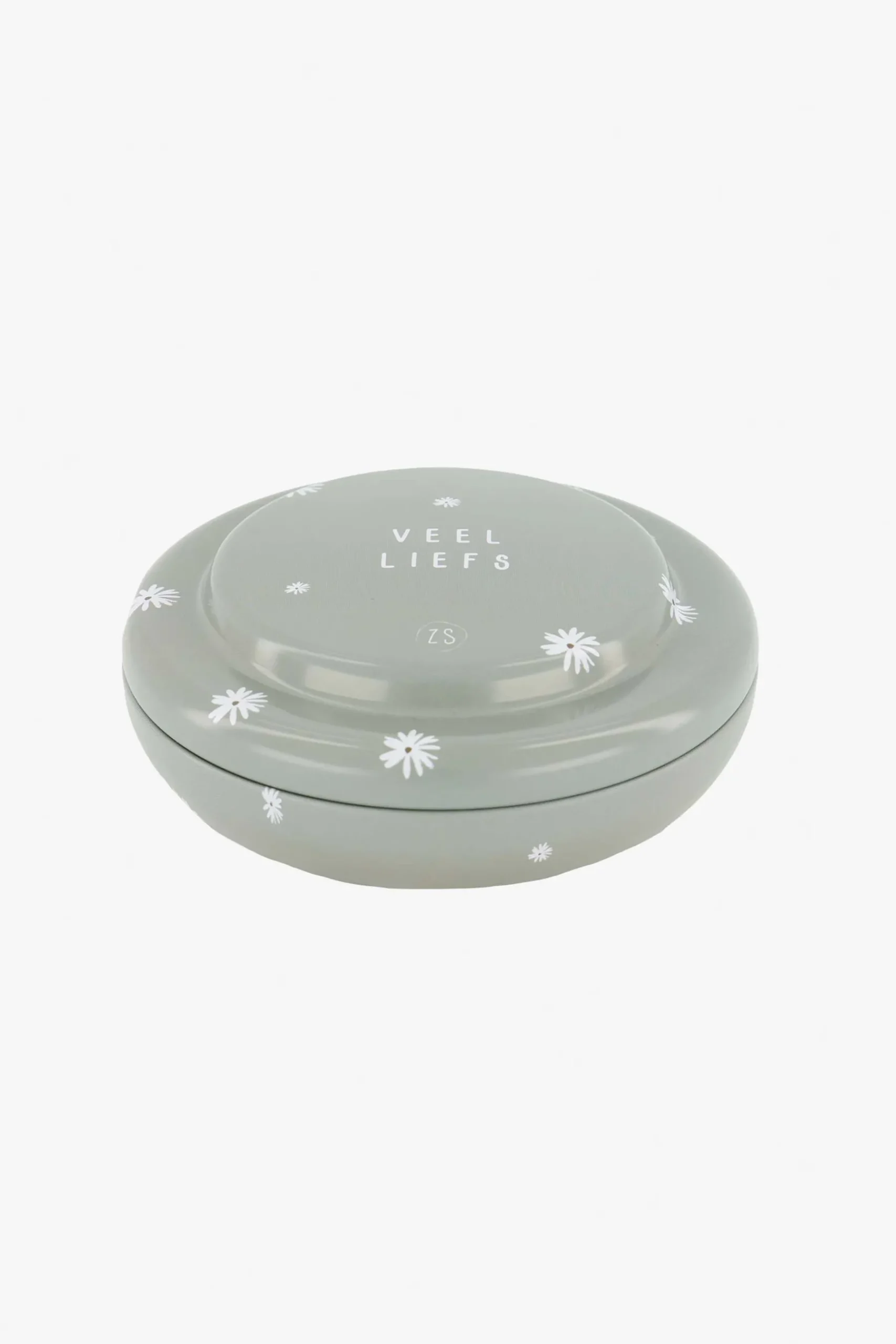 Zusss tinnen geurkaars bamboe veel liefs saliegroen|Deze metalen geurkaars van Zusss is een fijne sfeermaker in huis. Deze lage kaars heeft een saliegroene buitenkant met daarop madeliefjes en op de bovenzijde staat de tekst: veel liefs. Hierdoor is dit item perfect om een ander een te verrassen. Bijvoorbeeld om een hart onder de riem te steken of te feliciteren. De kaars is in een metalen vorm gegoten en heeft drie lontjes om ‘m aan te steken. De doorsnede van deze geurkaars is 14 cm en de hoogte 6 cm. Aan wie geef jij deze geurkaars kado ?|Zusss: basic, stoer, uniek en een tikkeltje eigenwijs.