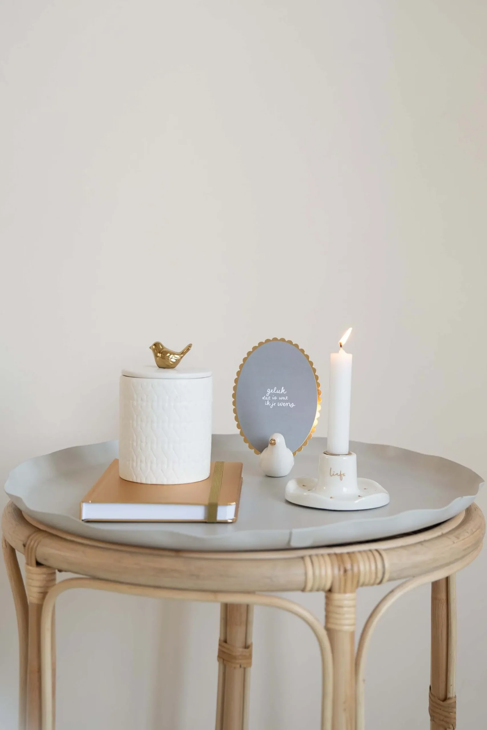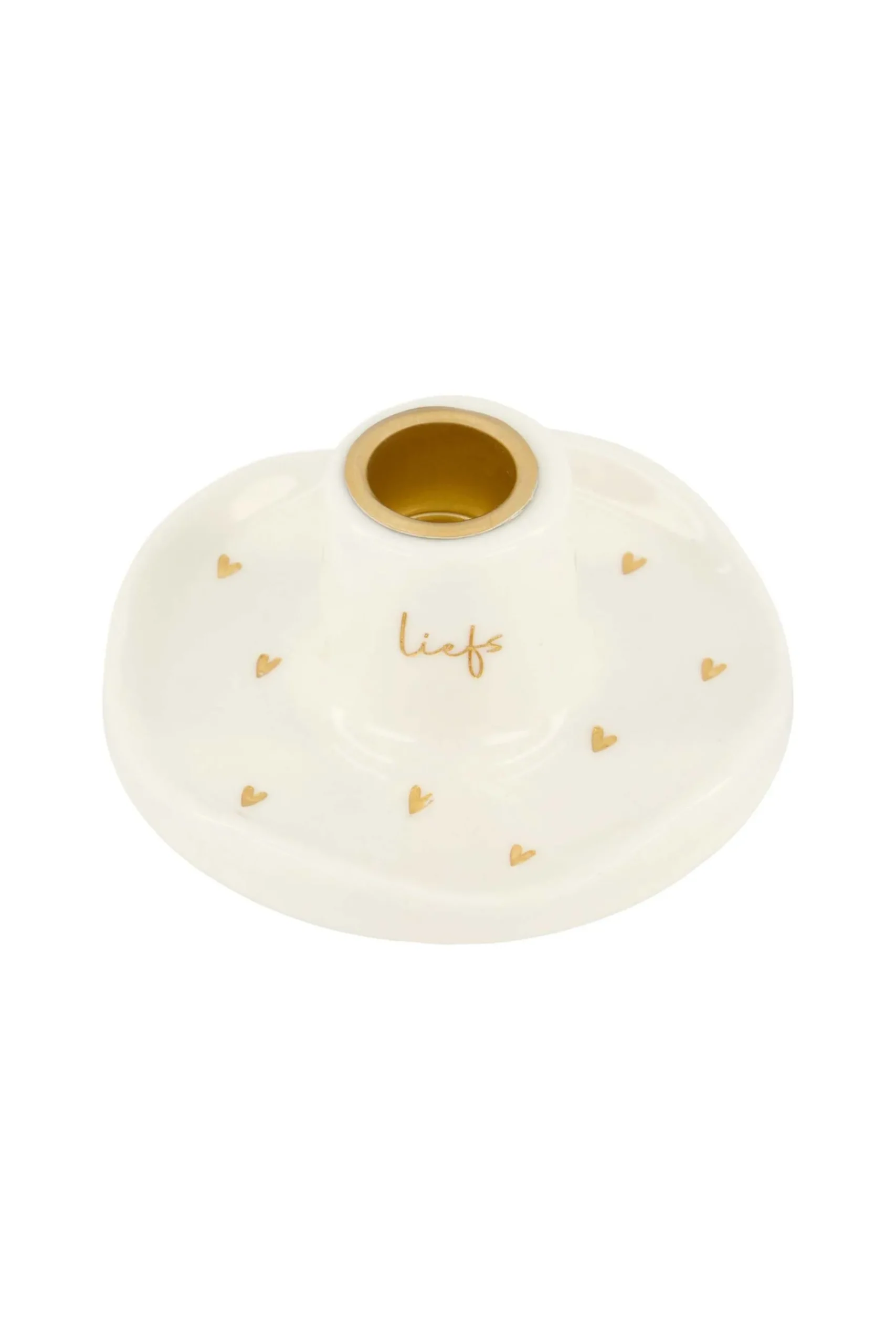 Zusss keramieken kandelaar hartjes liefs goud|In deze kandelaar van Zusss kun je de leukste kaarsen branden. Deze kandelaar is gemaakt van keramiek en heeft een ronde vorm. Deze witte kleur is gemakkelijk te combineren met andere woonaccessoires. Op deze kandelaar staan gouden hartjes en ‘liefs’. In deze kandelaar passen de rustieke Zusss kaarsen van 12cm en 20cm, en de geribbelde Zusss kaarsen van 20cm. De kandelaar is 5×10,5cm groot. Ook erg leuk te combineren met andere Zusss kaarsenhouders of een leuke vaas!|Zusss: basic, stoer, uniek en een tikkeltje eigenwijs.