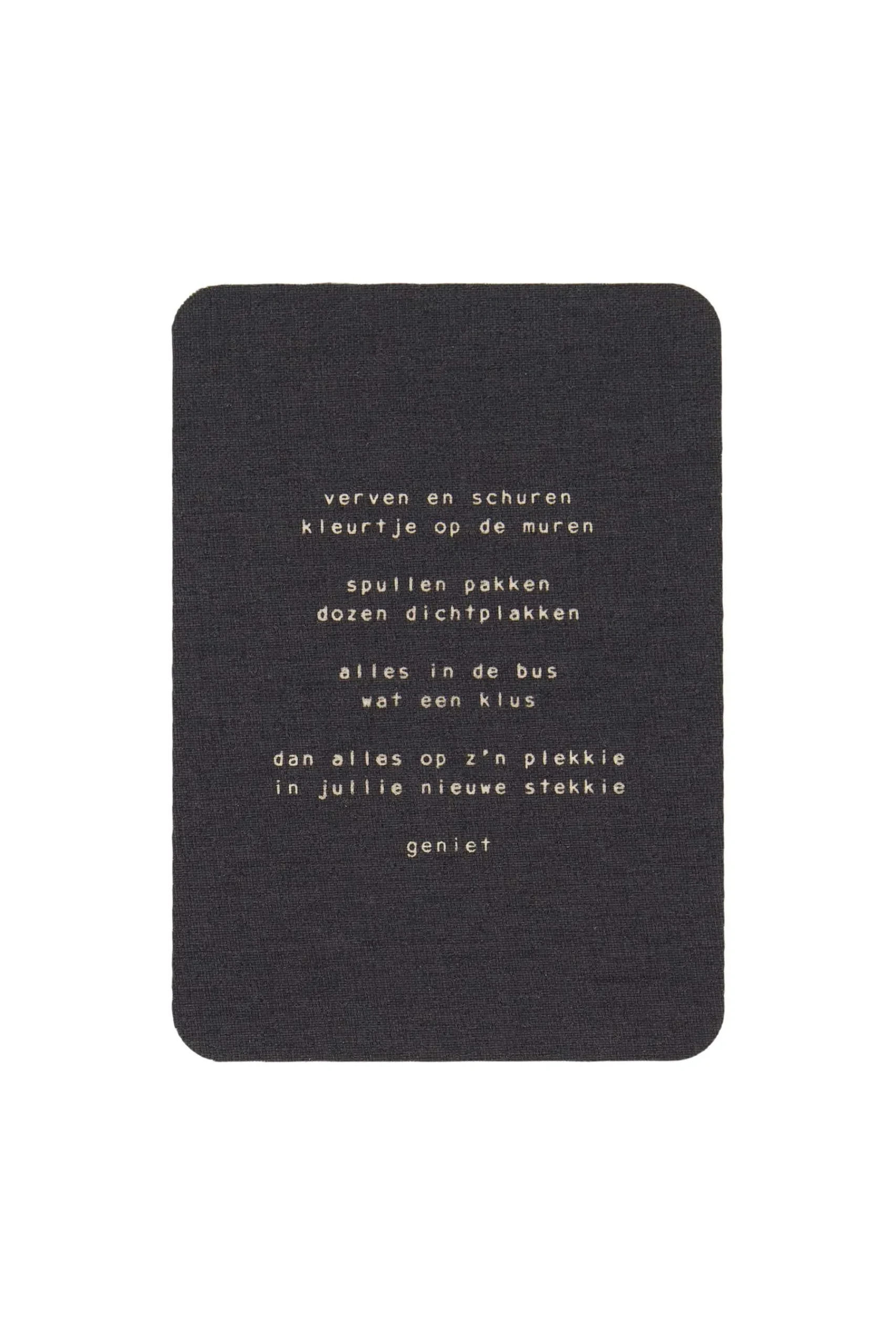 Zusss linnen kaart nieuw stekkie antracietgrijs|Dit Zusss kaartje valt zeker op tussen de andere kaarten! Wie maak jij blij met deze antracietgrijze kaart? Op deze linnen kaart staat een o zo leuk gedichtje over een nieuw stekkie. Wil je het plaatje helemaal compleet maken? Combineer de kaart dan met een leuk Zusss kadootje.|Zusss: basic, stoer, uniek en een tikkeltje eigenwijs.