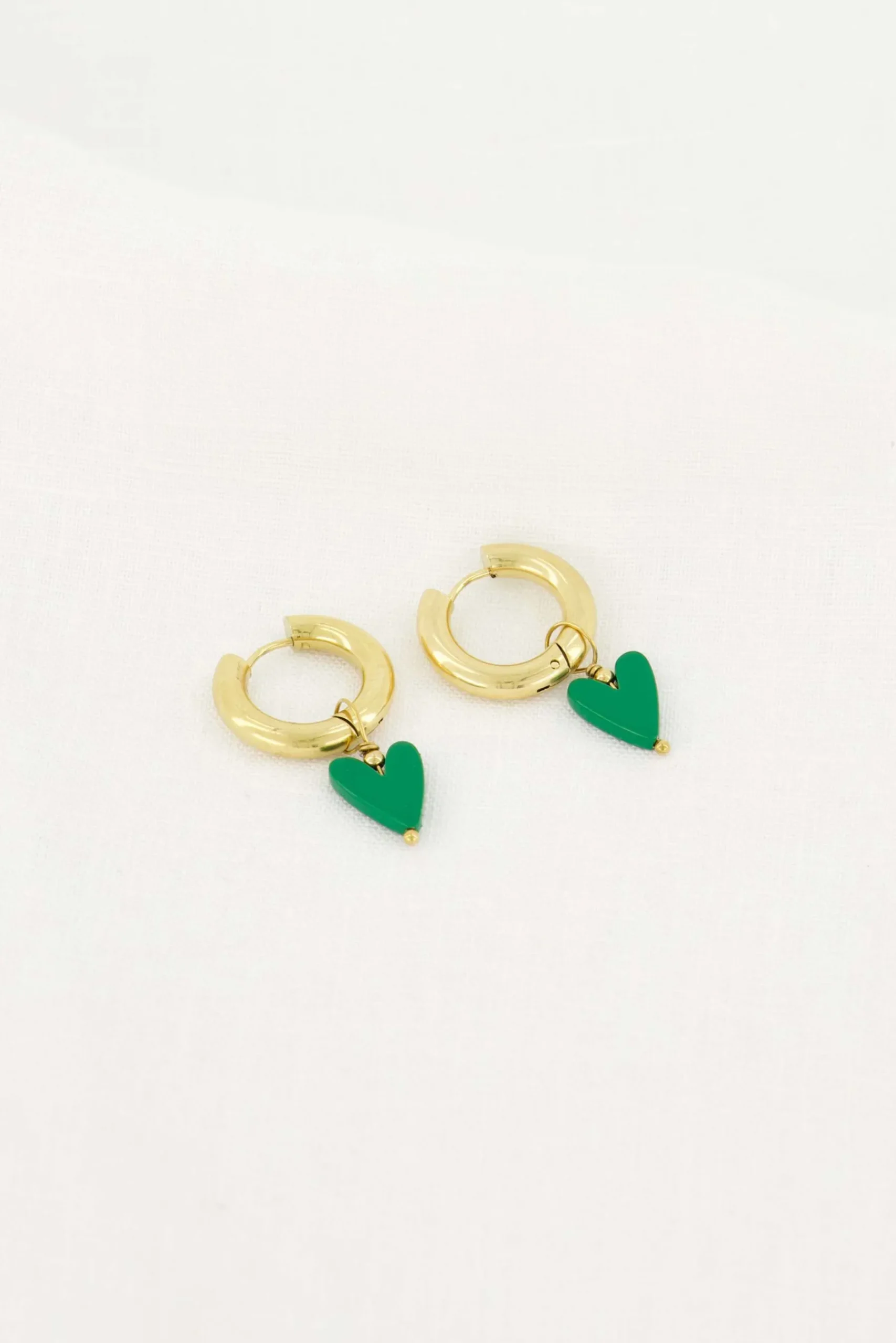 Zusss oorbel met hartje donkergroen|Deze oorbellen van Zusss zijn zo gaaf! De oorringen hebben subtiele structuur waardoor ze nét even wat anders zijn. Wat een leukerds! Aan de gouden oorbel hangt een groen Zusss hartje. Je combineert ze met andere mooimakers van Zusss! De oorbellen zijn gemaakt van stainless steel en verkleurden hierdoor niet. De oorringen zijn 2 centimeter lang en 1,3 centimeter breed. Met welke sieraden match jij ze? Ze zijn ook erg leuk om kado te geven!|Zusss: basic, stoer, uniek en een tikkeltje eigenwijs.