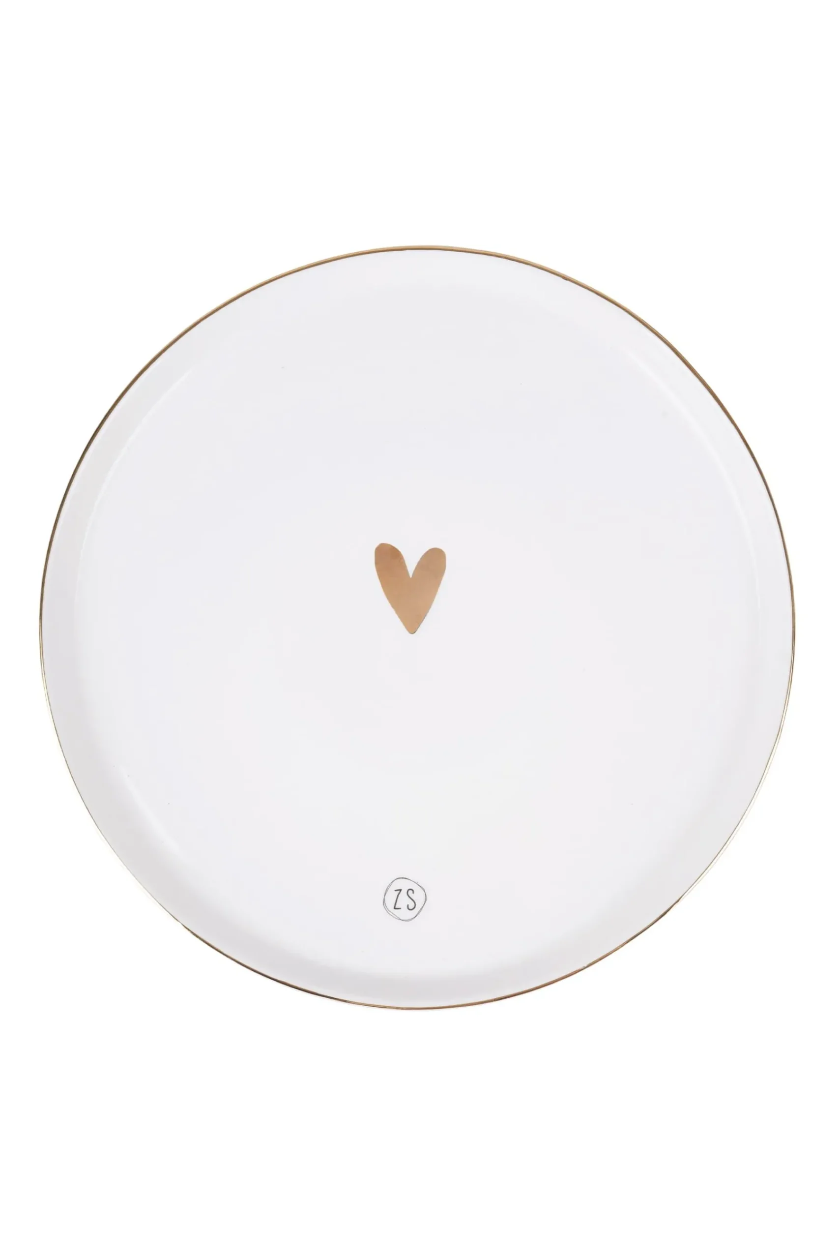 Zusss dinerbord met goud hartje en randje|Met dit dinerbord van Zusss word tafelen nóg leuker! Het bord bevat gouden details. Naast het gouden hartje wat staat afgebeeld op het bord heeft het bord ook een gouden randje. Kenmerkend van goud geglazuurd servies is dat dit niet in de vaatwasser kan, vandaar dat je dit bordje ook met de hand af moet wassen. Het bord is gemaakt van aardewerk en is 27cm breed. Op de voorkant van het bord vind je ook een subtiel Zusss logo. Leuk om deze borden te combineren met andere aardewerk items met gouden hartjes. Je bekijkt ze in de categorie servies.|Zusss: basic, stoer, uniek en een tikkeltje eigenwijs.
