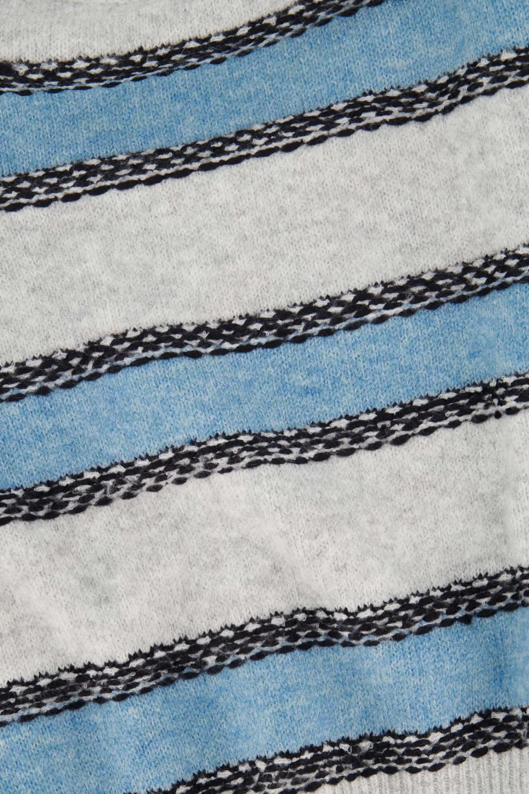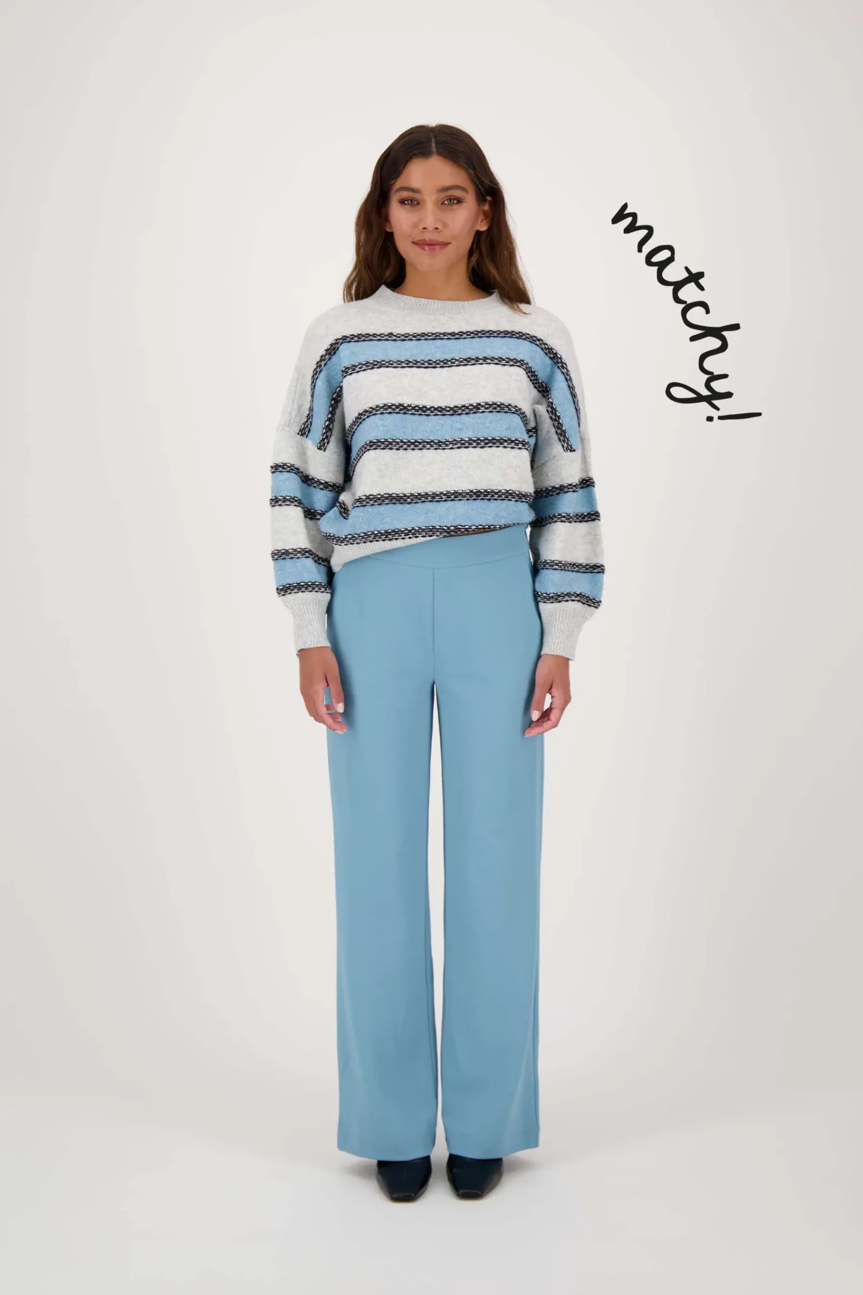 Zusss trui met strepen grijsblauw|Een zachte fijngebreide trui van Zusss. Met deze gestreepte trui kun je alle kanten op! Draag ‘m met een relaxte outfit voor een avondje op de bank of op een Zusss jeans voor een dagje uit. Heb jij al een gelegenheid in gedachten? De trui heeft lange mouwen en is gestreept in de kleuren: lichtblauw, lichtgrijs en een beetje zwart. Dit item is gemaakt van 47% acetaat, 22% nylon en 20% wol. Vergeet niet om een kijkje te nemen bij de rest van het Zusss kleding assortiment. Welk item combineer jij met deze trui?|Zusss: basic, stoer, uniek en een tikkeltje eigenwijs.