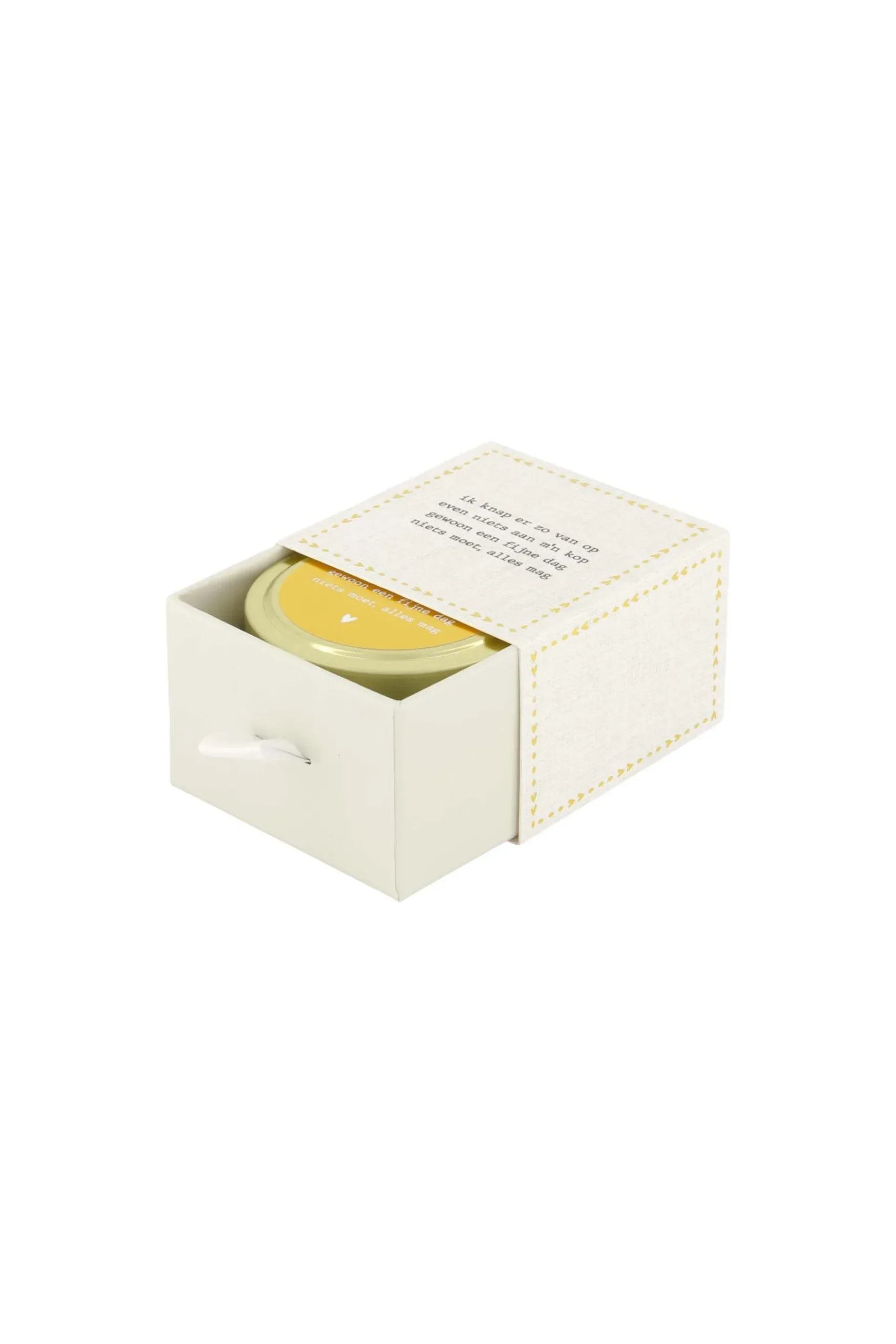 Zusss geurkaars in schuifdoosje gedicht linnen-goud|Een kaarsje aansteken is altijd fijn, zeker bij een gezellig samen zijn. Deze geurkaars van Zusss zit in een goudkleurig blikje met daarop een mooi gedichtje. Extra leuk, dit geurkaarsje zit in een linnenkleurig schuifdoosje. Erg leuk als kadootje! Ook op het doosje staat het gedichtje. Deze geurkaars verspreidt de geur van warm wool wat zorgt voor een gezellige, winterse sfeer in huis. Deze geurkaars heeft ca 16 branduren. Tip: neem ook eens een kijkje bij de Zusss kaarsenhouders! |Zusss: basic, stoer, uniek en een tikkeltje eigenwijs.