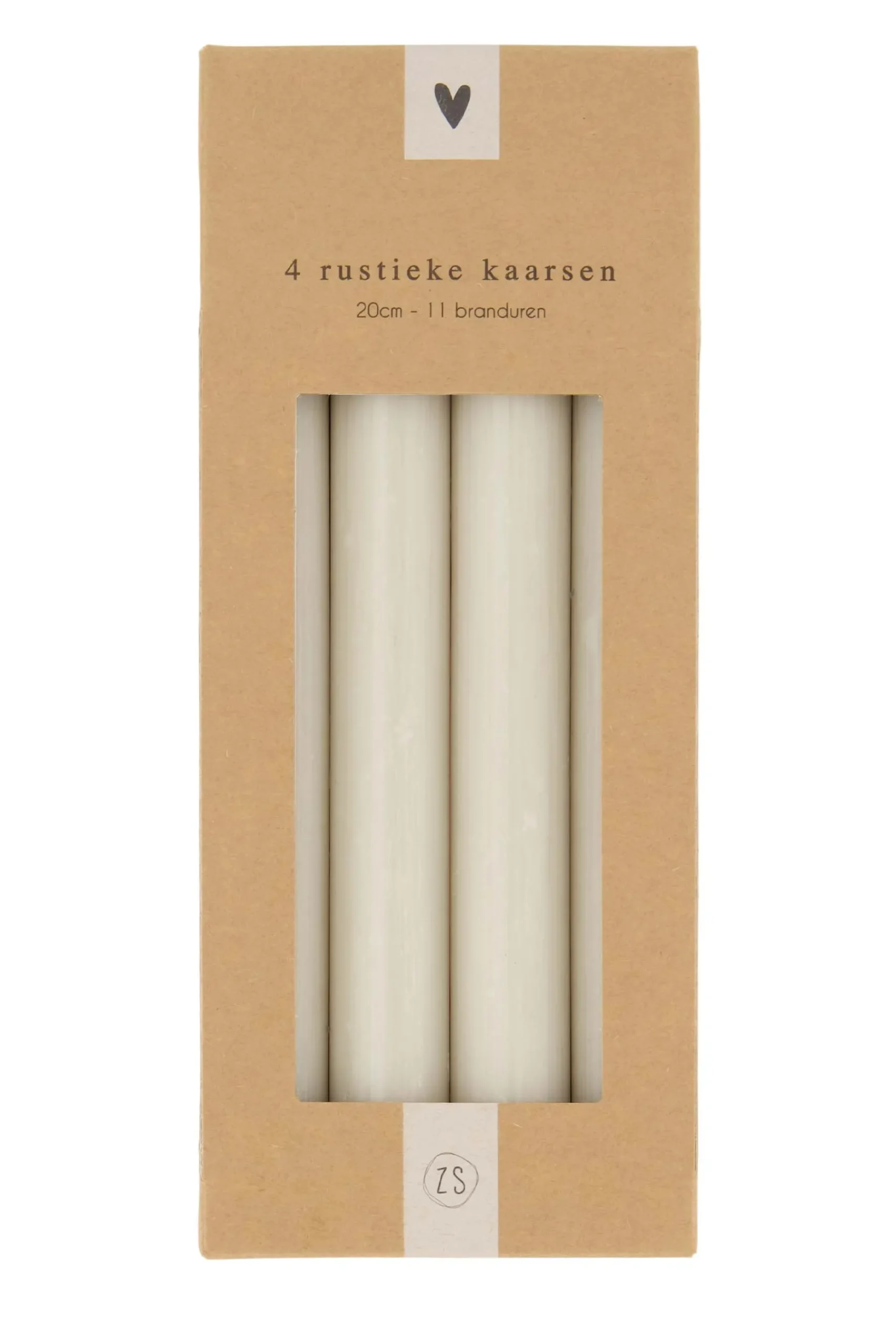 4 rustieke Zusss kaarsen|Kaarsen branden is zo fijn, heerlijk om lekker thuis te zijn! Steek de kaarsjes aan en maak het lekker gezellig thuis! In deze verpakking zitten 4 rustieke Zusss kaarsen. Deze hebben een krijtkleur en zijn 20×2,2 centimeter groot. Ze passen in de Zusss kaarsenhouders. Elke kaars heeft ongeveer 11 branduren. Let op: in de kleine kandelaartjes van Zusss passen deze kaarsen niet. Bestel hiervoor een doosje met 10 smalle kaarsjes.|Zusss: basic, stoer, uniek en een tikkeltje eigenwijs.