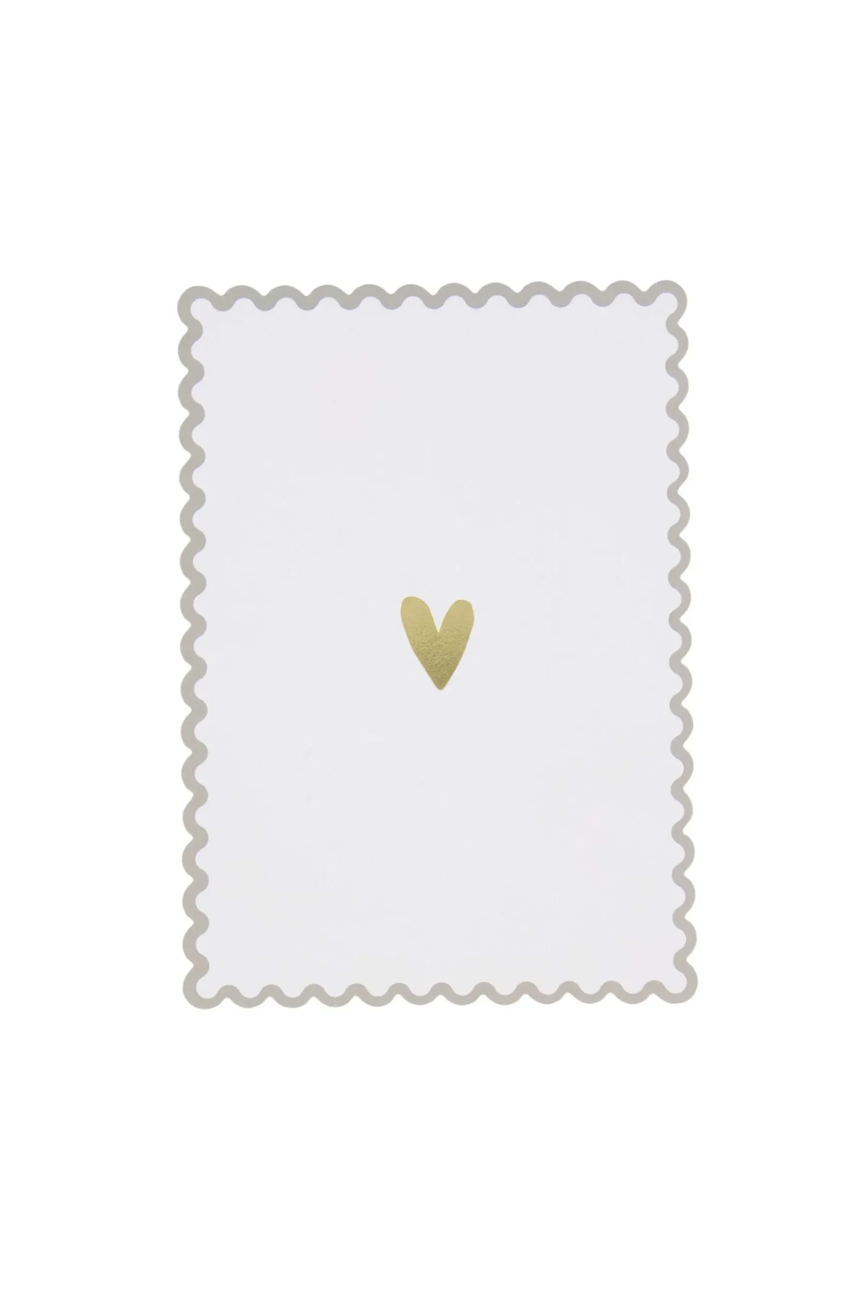 Zusss ansichtkaart hartje schulp wit/goud/zand|Dit Zusss kaartje valt zeker op tussen alle andere kaarten! Deze witte kaart heeft een geschulpte rand in de kleur zand. In het midden van de kaart staat een gouden hartje. Het is altijd leuk om een kaartje te ontvangen of te sturen! Het plaatje helemaal compleet maken? Kijk ook eens bij de Zusss kadootjes! |Zusss: basic, stoer, uniek en een tikkeltje eigenwijs.