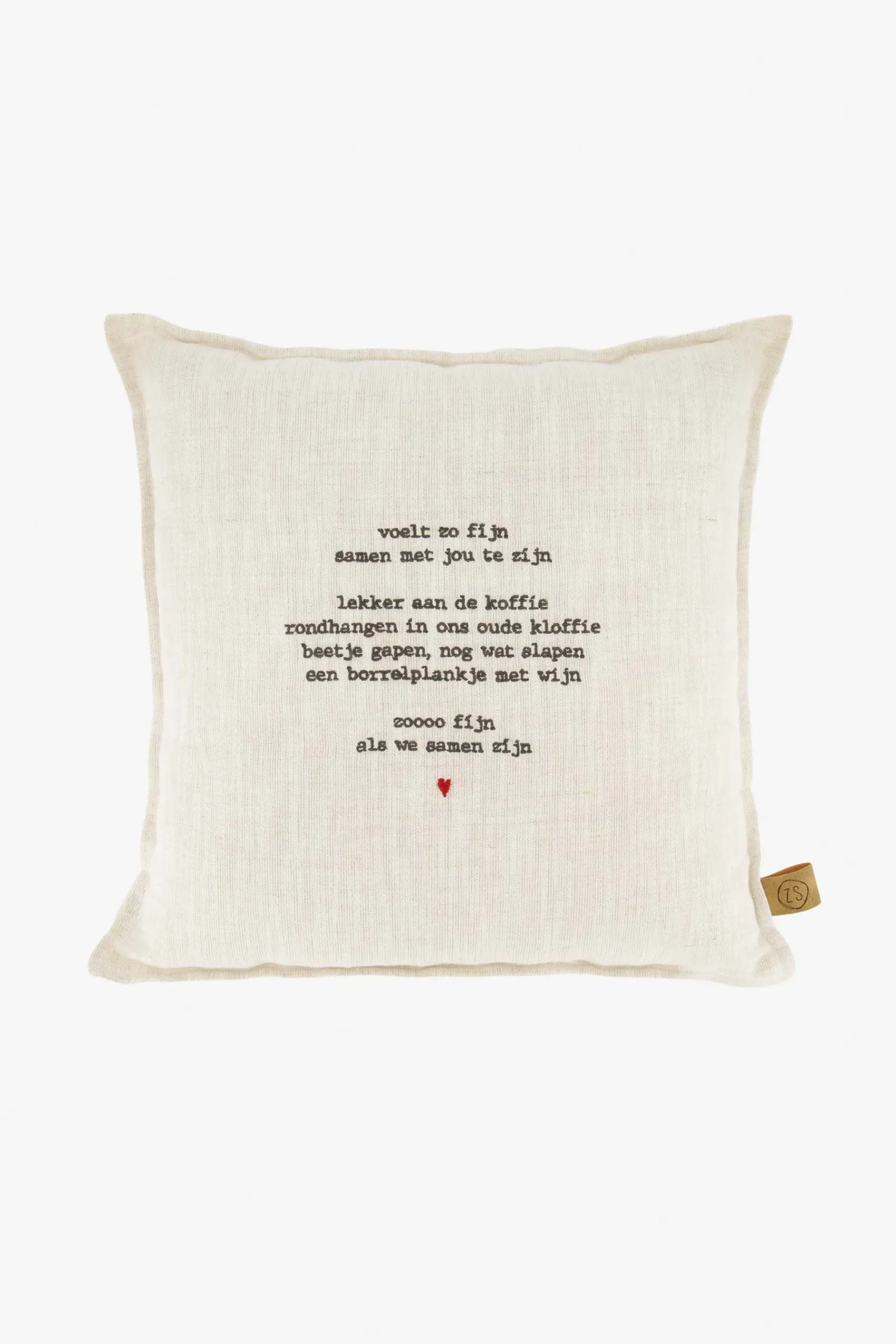 Zusss kussen voelt zo fijn 35x35cm peper en zout|Dit Zusss kussentje is zoo leuk! Dit item springt er echt uit door het leuke gedicht dat erop staat. Dit mooie kussen is peper en zout kleurig en is gemaakt van 50% katoen en 50% linnen. Het kussen is 35cm breed en 35cm hoog. Het Zusss logo vind je terug op het PU labeltje aan de zijkant van het kussen. Deze is ook erg leuk om kado te geven!|Zusss: basic, stoer, uniek en een tikkeltje eigenwijs.